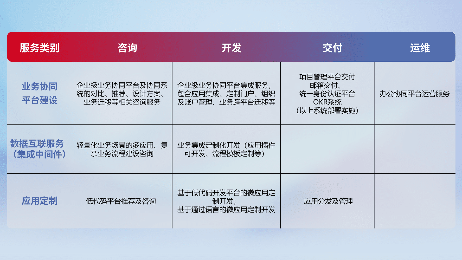 针对钉钉、、、企微、、IDaas等平台级产品提供产品的规划、、、方案、、交付、、定制化开发等服务,,实现如统一协同办公、、智能客户服务、、、、混合会议管理、、、、智能数据查询、、等业务场景,,,,实现数字化转型。。。